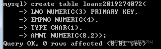 - Create a new table called loans with columns named LNO NUMERIC (3), EMPNO NUMERIC (4), TYPE CHAR(1), AMNT NUMERIC (8,2)