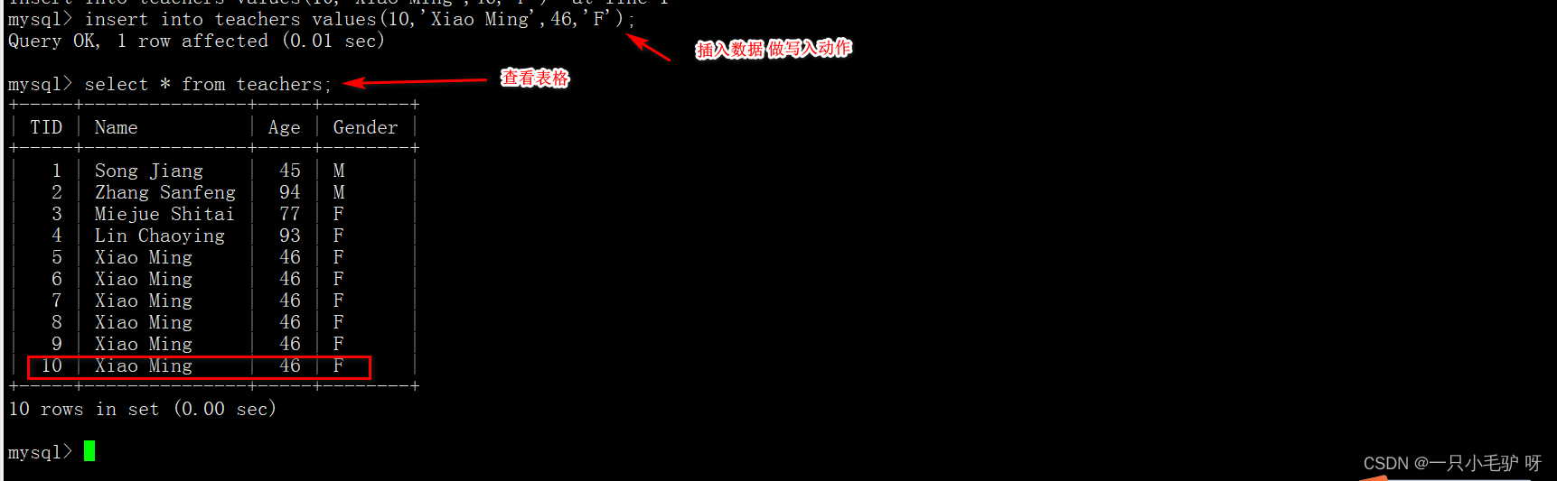 insert into teachers values(10,'Xiao Ming',46,'F');