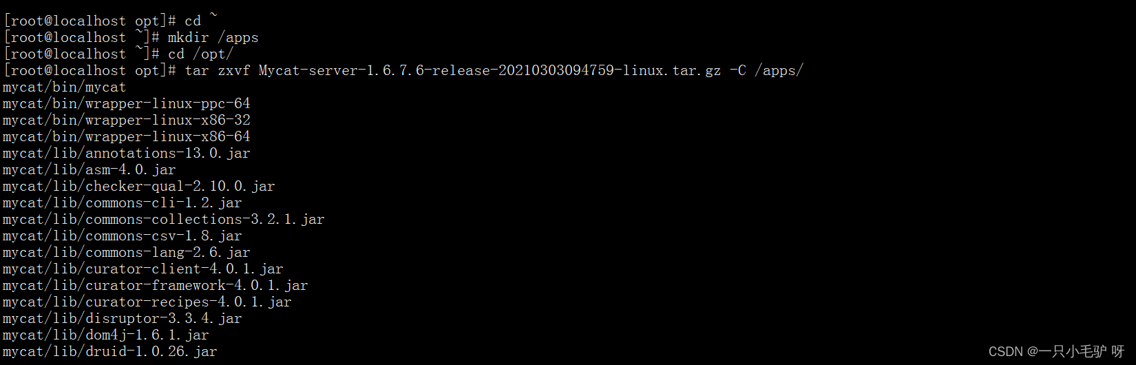 [root@localhost ~]#tar zxvf Mycat-server-1.6.7.6-release-20210303094759-linux.tar.gz -C /apps/
