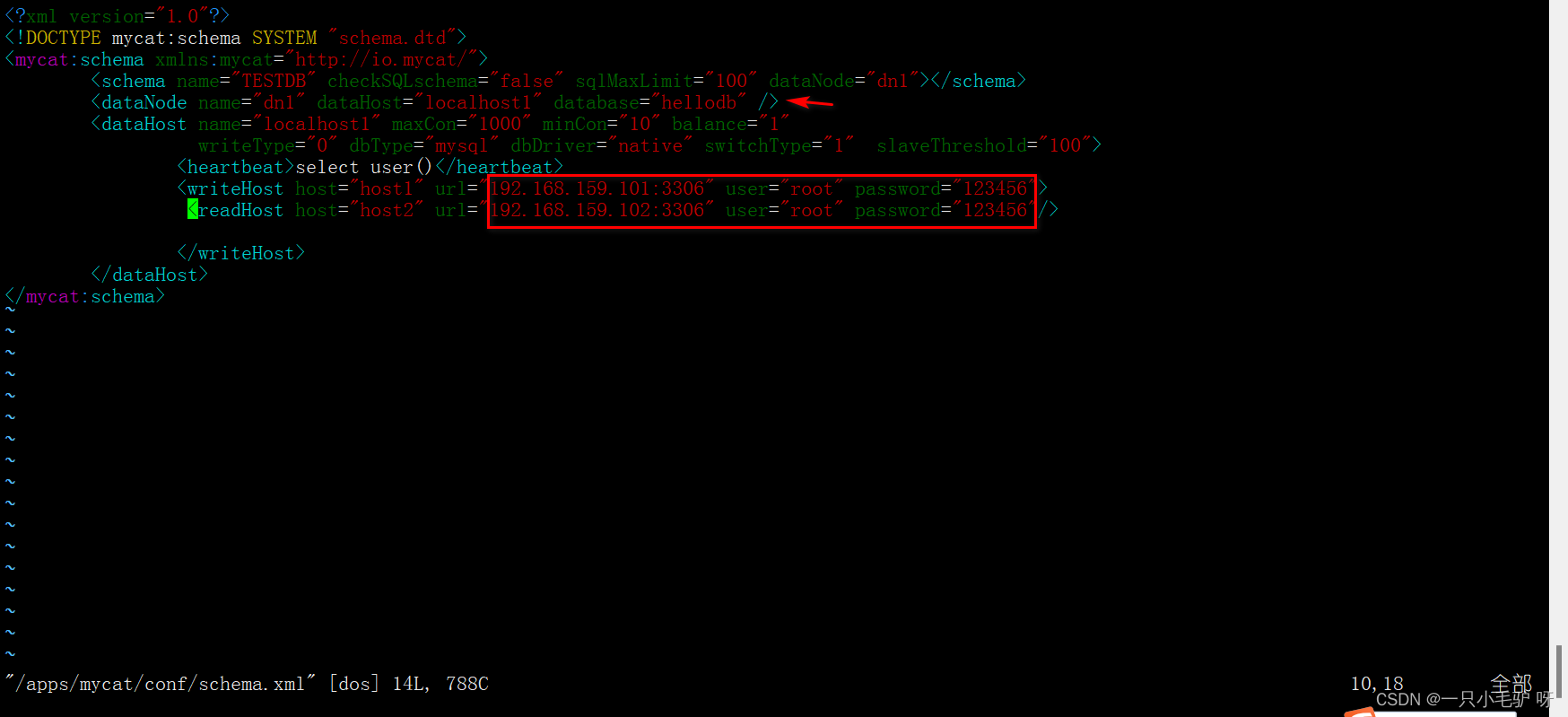 schema.xml是最主要的配置项,此文件关联mysql读写分离策略,读写分离、分库分表策略、分片节点都是在此文件中配置的.MyCat作为中间件,它只是一个代理,本身并不进行数据存储,需要连接后端的MySQL物理服务器,此文件就是用来连接MySQL服务器的。
