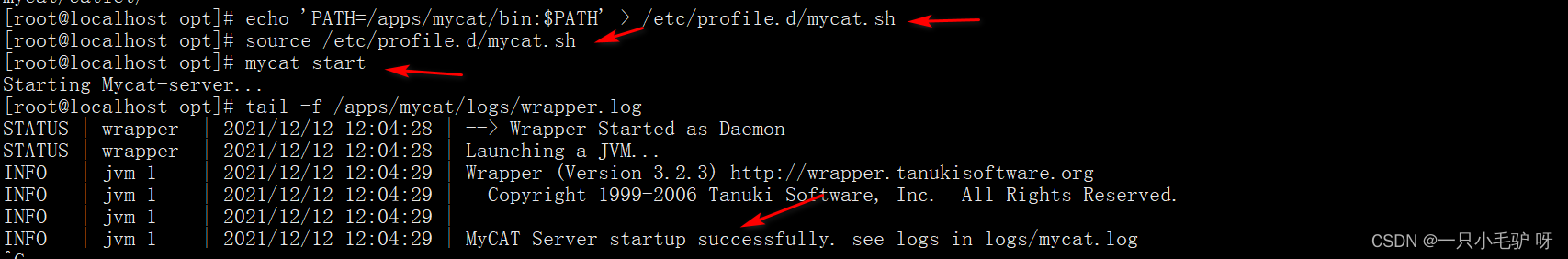 [root@localhost ~]#echo 'PATH=/apps/mycat/bin:$PATH' > /etc/profile.d/mycat.sh