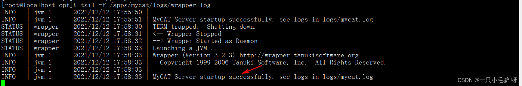 在mycat服务器上,重启mycat服务,查看启动日志,文末出现successfully