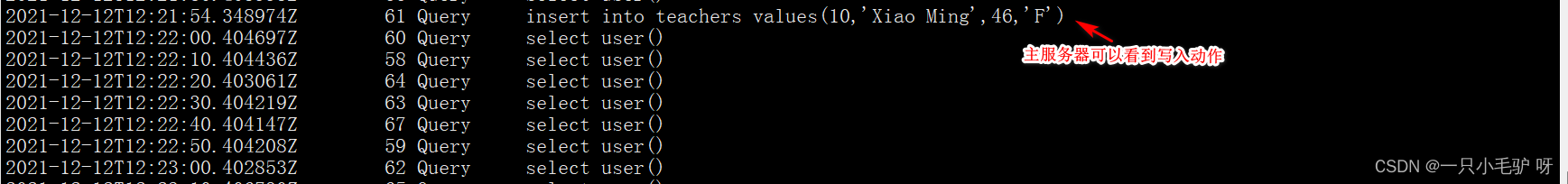 在客户机上的表中插入数据,并查看主从服务器实时日志,可以看到只有主服务器上有日志变化显示