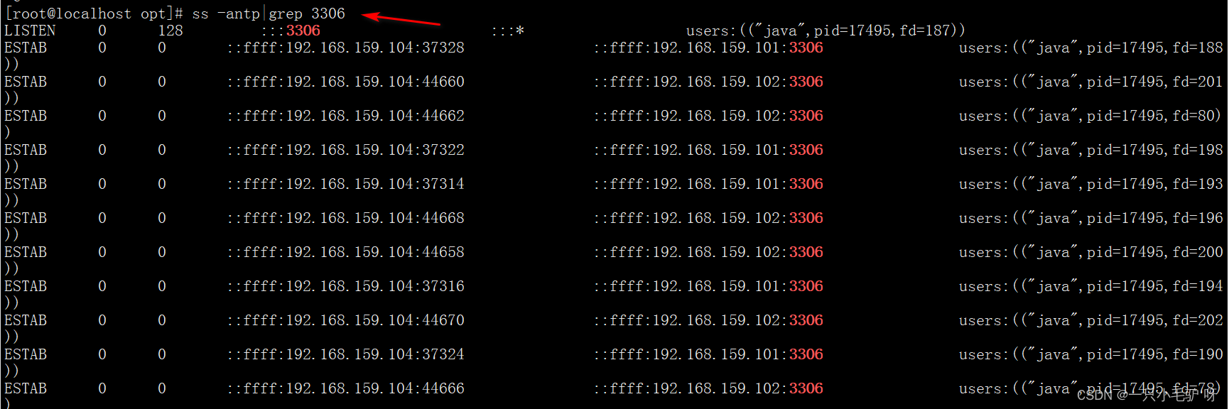 查看3306端口,可以监听到主从服务器(192.168.159.101、192.168.159.102)