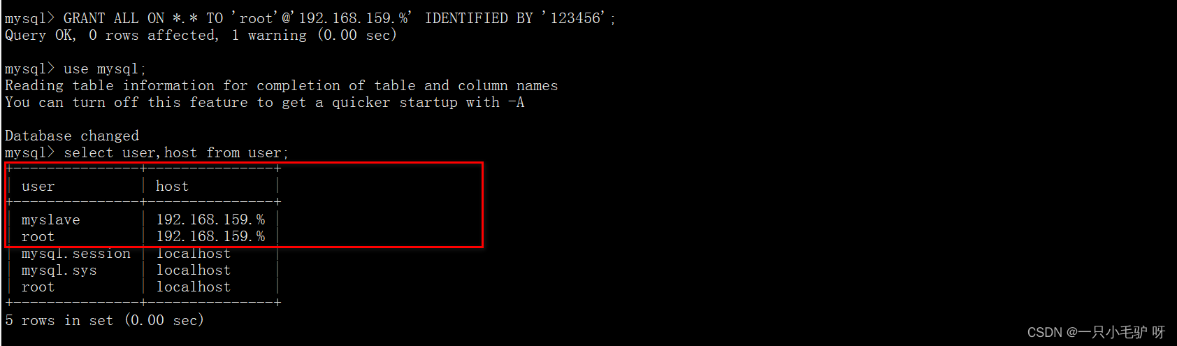 grant replication slave on *.* to 'myslave'@'192.168.159.%' identified by '123456';