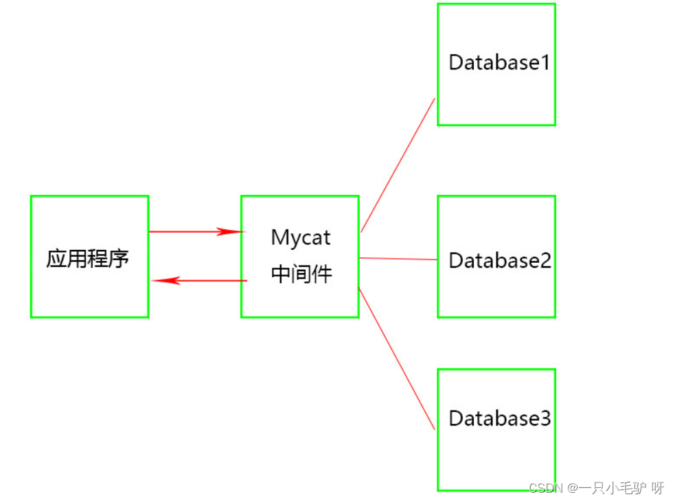 ?上述图片里,应用程序不再直接访问数据库,而是访问Mycat,由Mycat与数据库交互,数据库数据返回给Mycat,Mycat再返回给应用程序。三个Database才是真正的数据库,又称为三个节点,也称为三个分片。