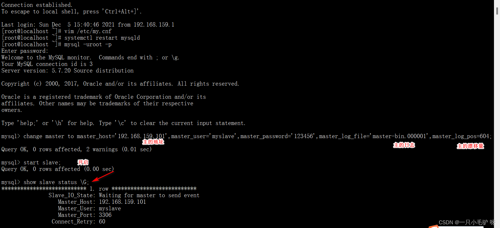 master_host='192.168.159.101',master_user='myslave',master_password='123456',master_log_file='master-bin.000001',master_log_pos=604;