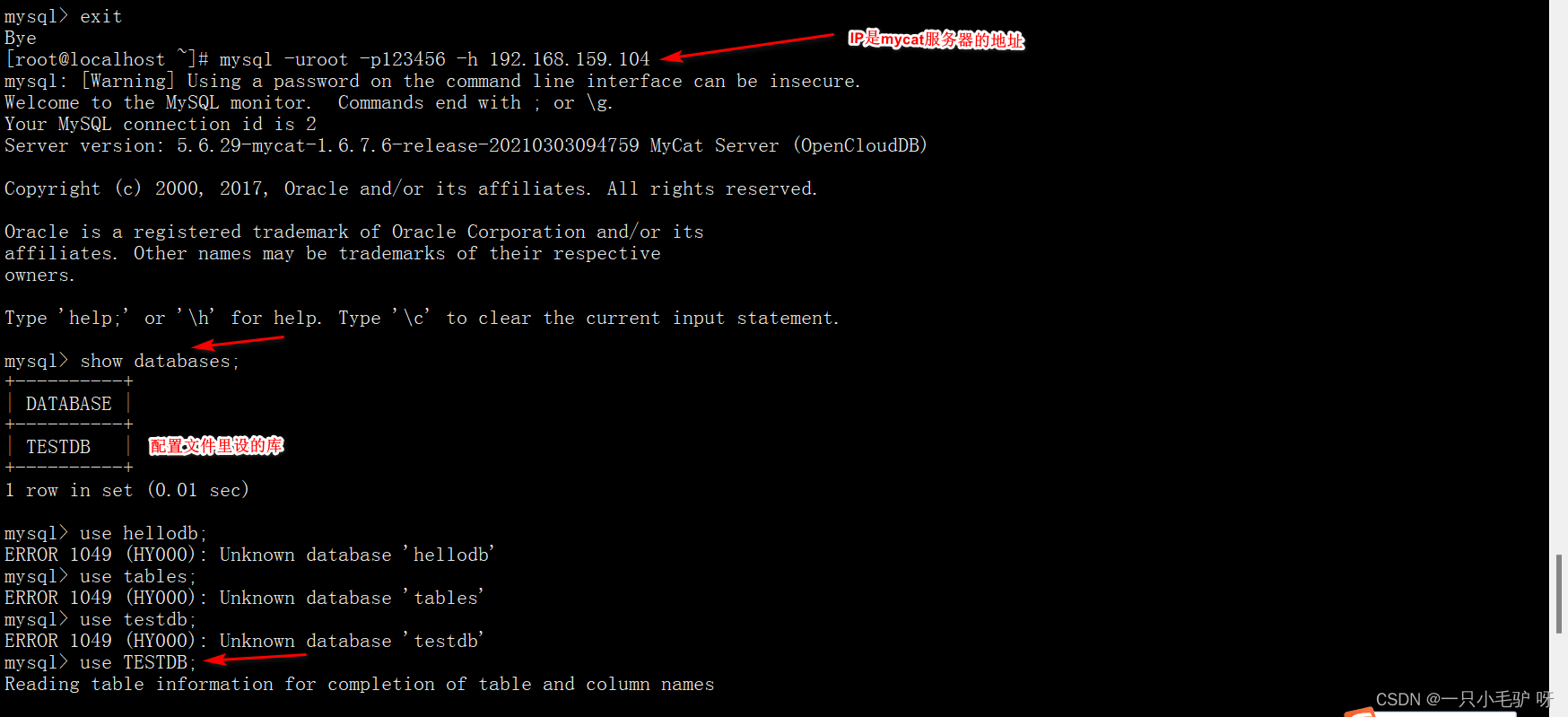 在客户机上登录mycat,这时可以不加端口直接进入数据库了