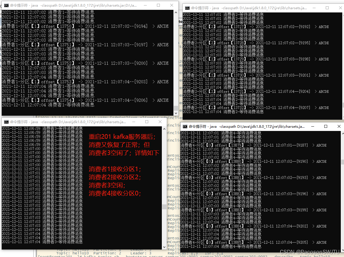 ?之所以 消费者3空闲,消费者4忙碌,是因为 broker 动态上下线,导致了分区再均衡使得分区所有权从消费者A转到消费者B(201宕机前,是消费者3忙碌,消费者4空闲);