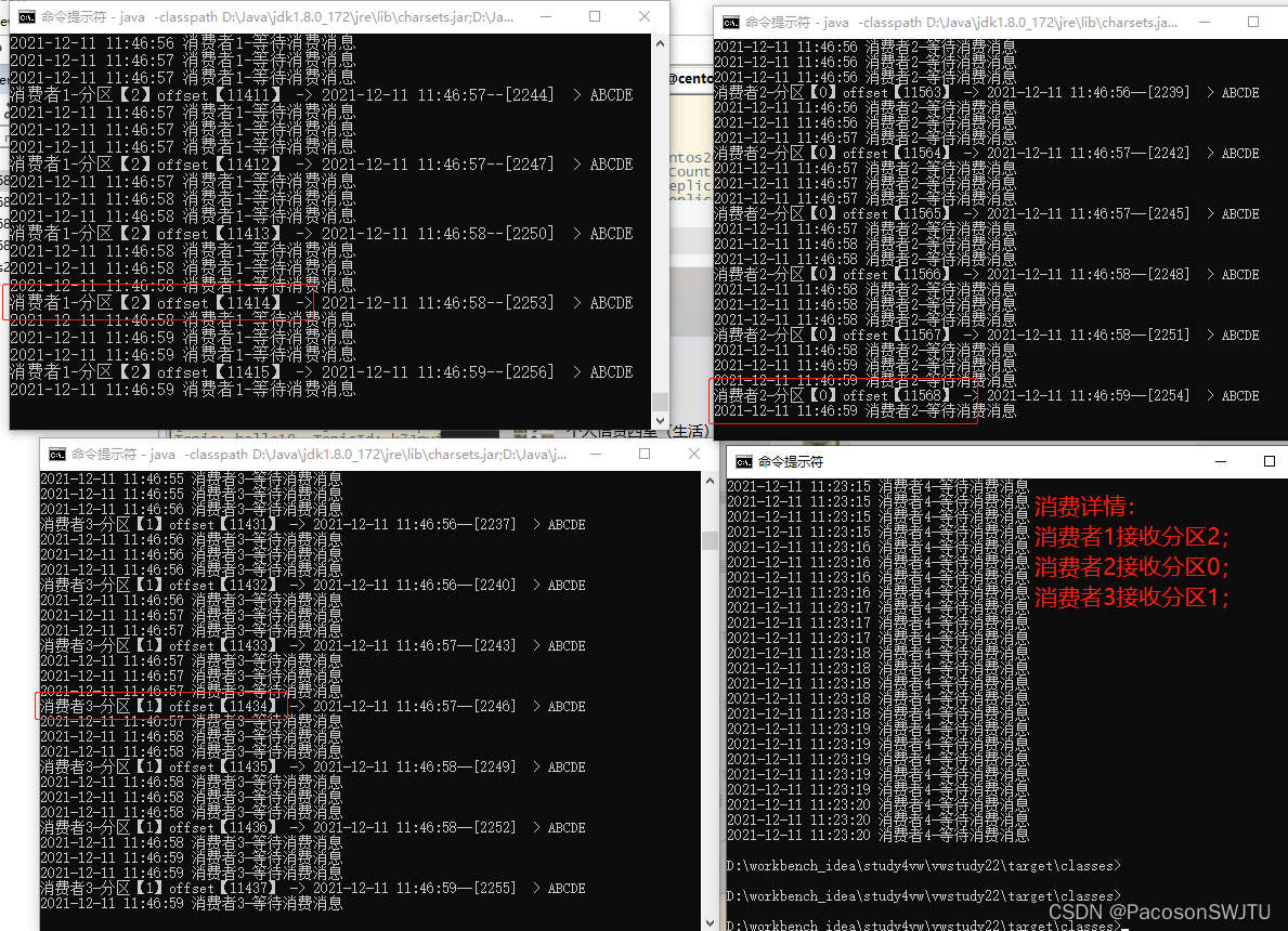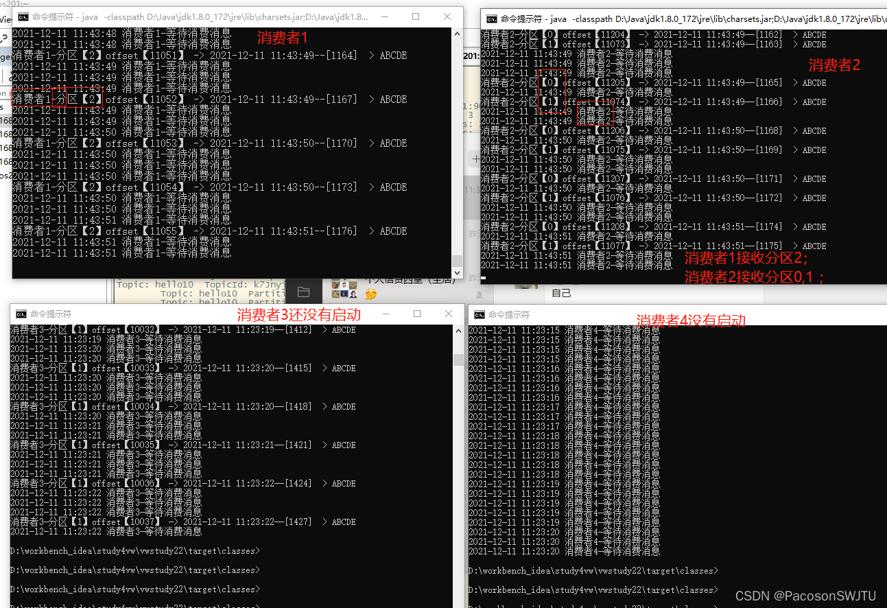 5)为了直观展示消费详情,我会用命令行启动4个不同消费者,而用idea启动生产者;但编译都通过maven;