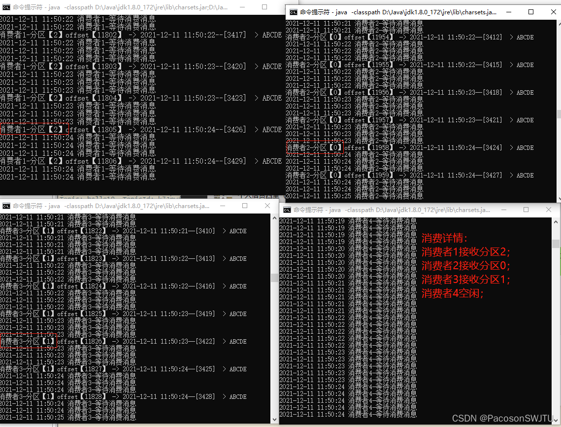 消费者1接收了个分区1消息; 消费者2接收了分区2的消息; 消费者3空闲; 消费者4接收了分区0的消息;