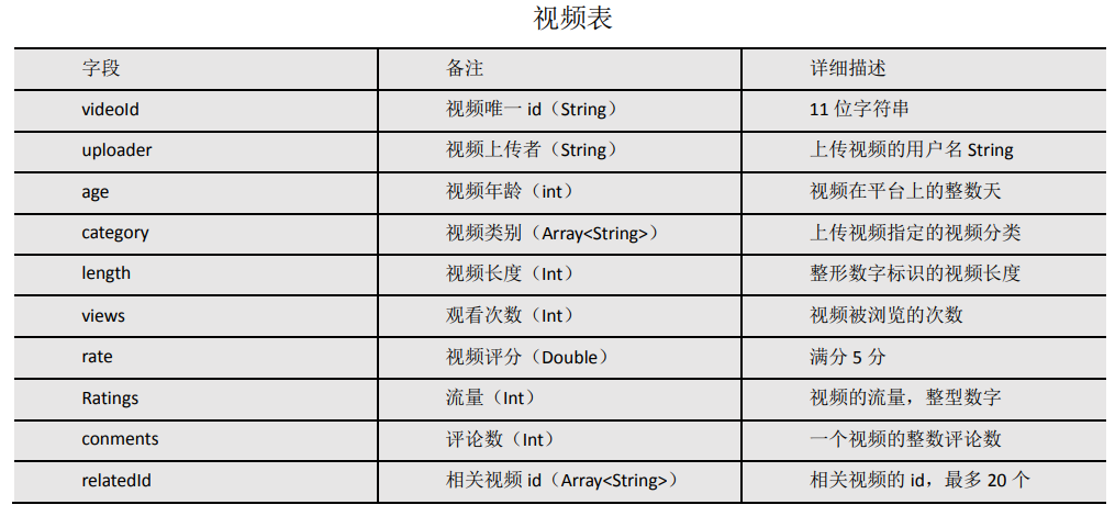 1)需要准备的表 创建原始数据表:gulivideo_ori,gulivideo_user_ori, 创建最终表:gulivideo_orc,gulivideo_user_orc 2)创建原始数据表: (1)gulivideo_ori