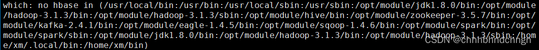 which: no hbase in (/usr/local/bin:/usr/bin:/usr/local/sbin:/usr/sbin:/opt/module/jdk1.8.0/bin:/opt/module/hadoop-3.1.3/bin:/opt/module/hadoop-3.1.3/sbin:/opt/module/hive/bin:/opt/module/zookeeper-3.5.7/bin:/opt/module/kafka-2.4.1/bin:/opt/module/eagle-1.4.5/bin:/opt/module/sqoop-1.4.6/bin:/opt/module/spark/bin:/opt/module/spark/sbin:/opt/module/jdk1.8.0/bin:/opt/module/hadoop-3.1.3/bin:/opt/module/hadoop-3.1.3/sbin:/home/xm/.local/bin:/home/xm/bin)