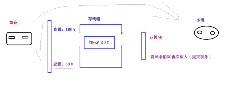 小花开个事务放50进去,这时小明也开了个事务放50进去,导致小明覆盖了小花,小花事务丢失,总金额只有150