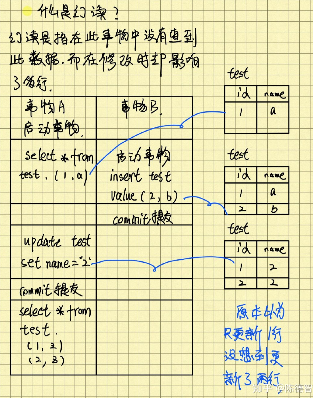 a事务中有查询和修改两个动作,查询只有一条数据和修改以为也只有一条,但是在同一时间b事务插入了一条数据并提交事务,a事务的修改就修改了两条然后才提交事务。所以再次查询就修改了两条数据产生了幻读