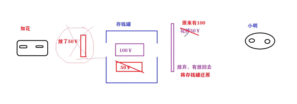 小明这个事务取50,然后中途放弃把50又还回去(回滚),这时如花这个事务放了50进去,跟回滚重合如花这个事务就丢失了。