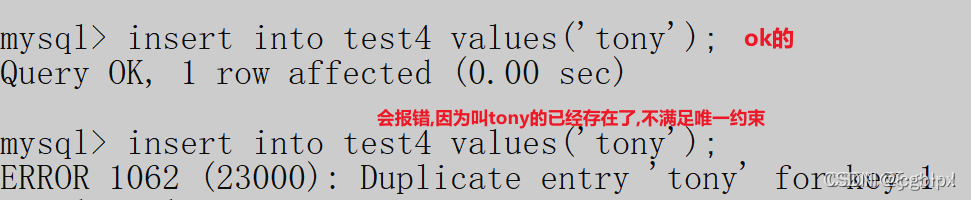 –3,唯一约束 哪个字段,添加了唯一约束,哪个字段的值,从此,必须唯一不能重复. 使用unique来实现.但可以为空。