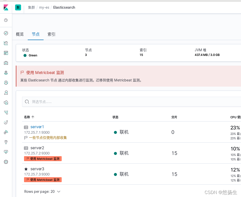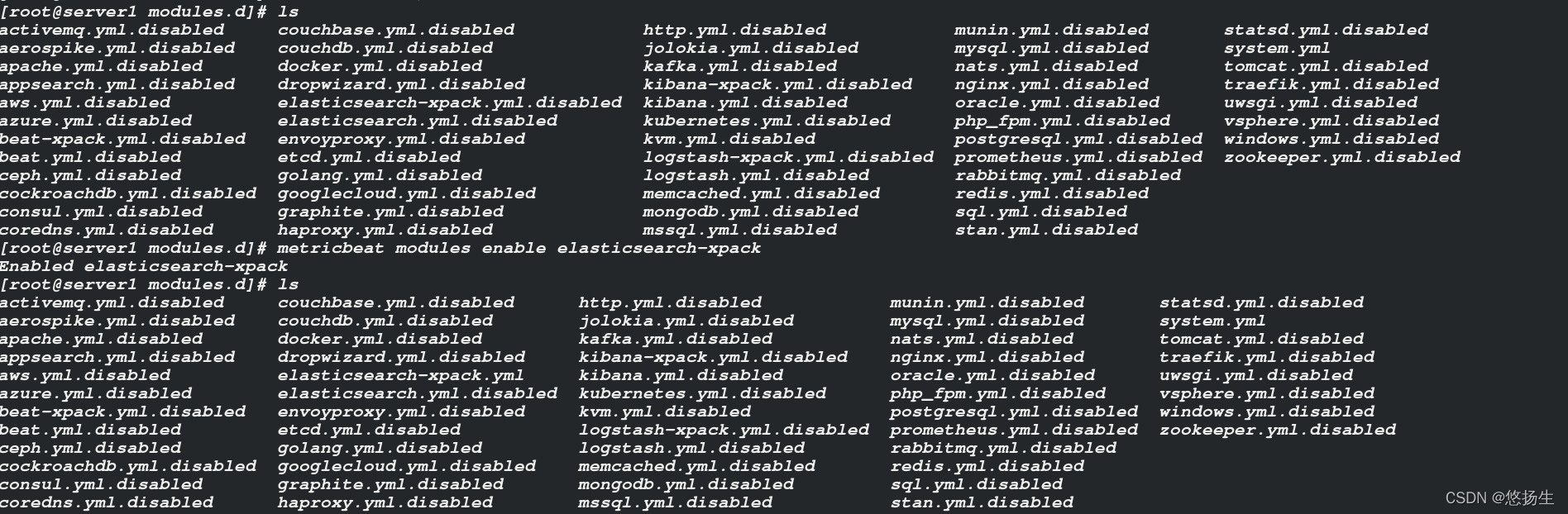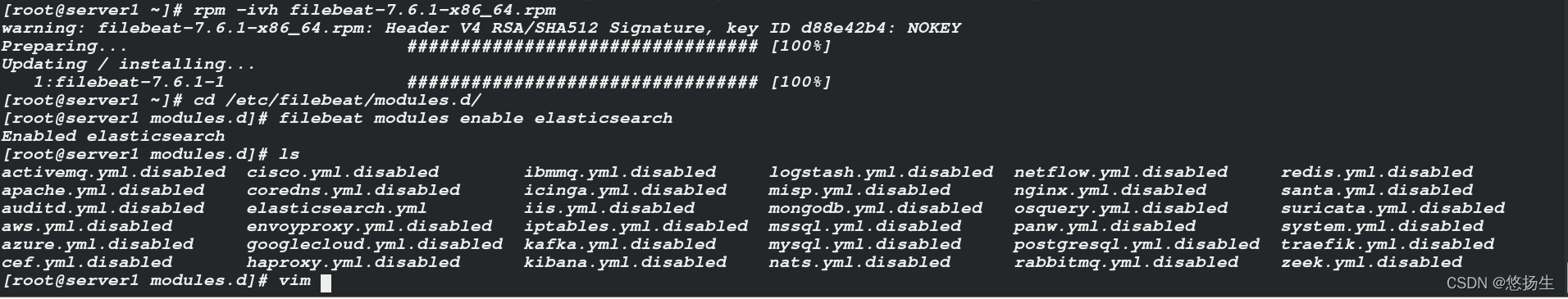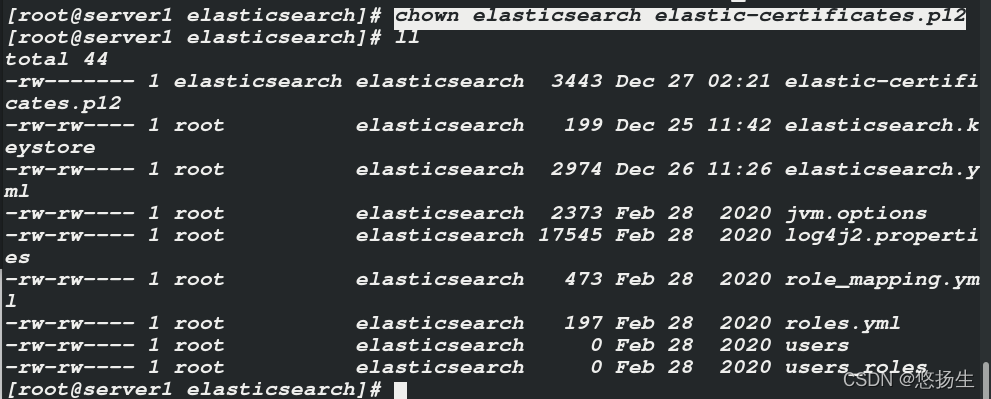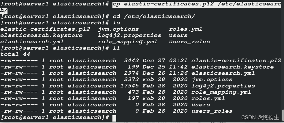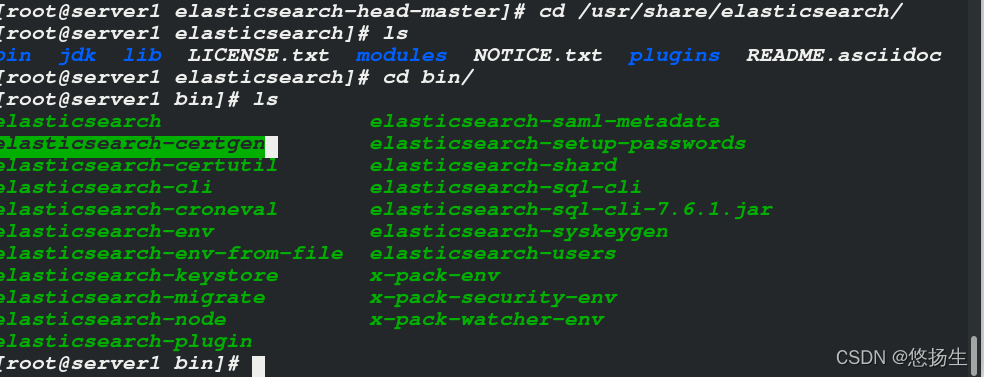 [root@server1 elasticsearch]# ls bin?????????????????????? jdk????????? modules???? README.asciidoc elastic-certificates.p12? lib????????? NOTICE.txt elastic-stack-ca.p12????? LICENSE.txt? plugins [root@server1 elasticsearch]