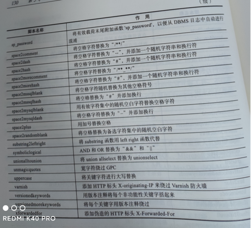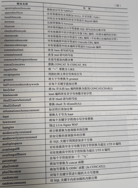 使用说明:sqlmap.py --tamper="模块名.py" apostrophemask #将单引号 url 编码 apostrophenullencode #将单引号替换为宽字节 unicode 字符 base64encode #base64 编码 between #将大于符号和等号用 between 语句替换,用于过滤了大于符 号和等号的情况 bluecoat #用随机的空白字符代替空格,并且将等号替换为 like ,用于过滤了空 格和等号的情况 charencode #用 url 编码一次你的 payload charunicodeencode #用 unicode 编码 payload ,只编码非编码字符