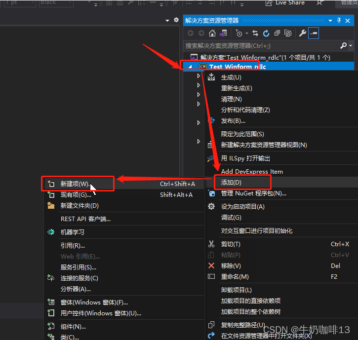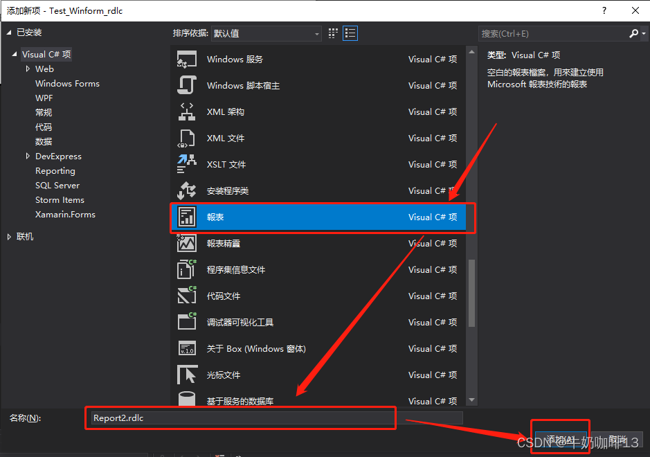 选中项目,点击鼠标右键-->选择【添加】-->选择【新建项】-->选择【报表】(可修改报表名称)