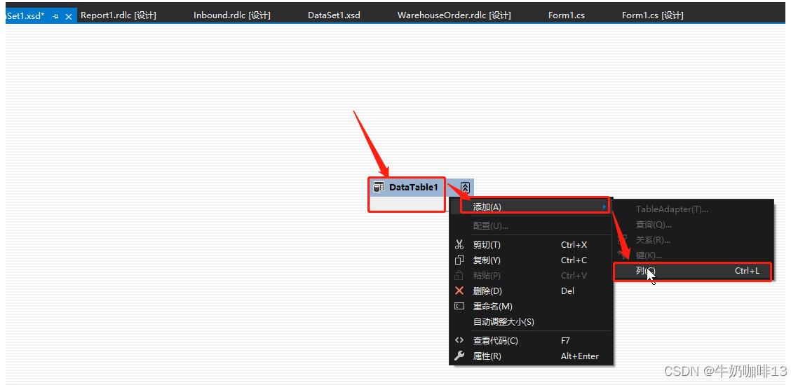 ?②创建好数据集后,从工具箱中拖入DataTable到数据集界面中;然后选中DataTable1组件,点击鼠标右键-->选择【添加】-->选择【列】,然后输入对应的列名称即可,我这里设计的内容如下: