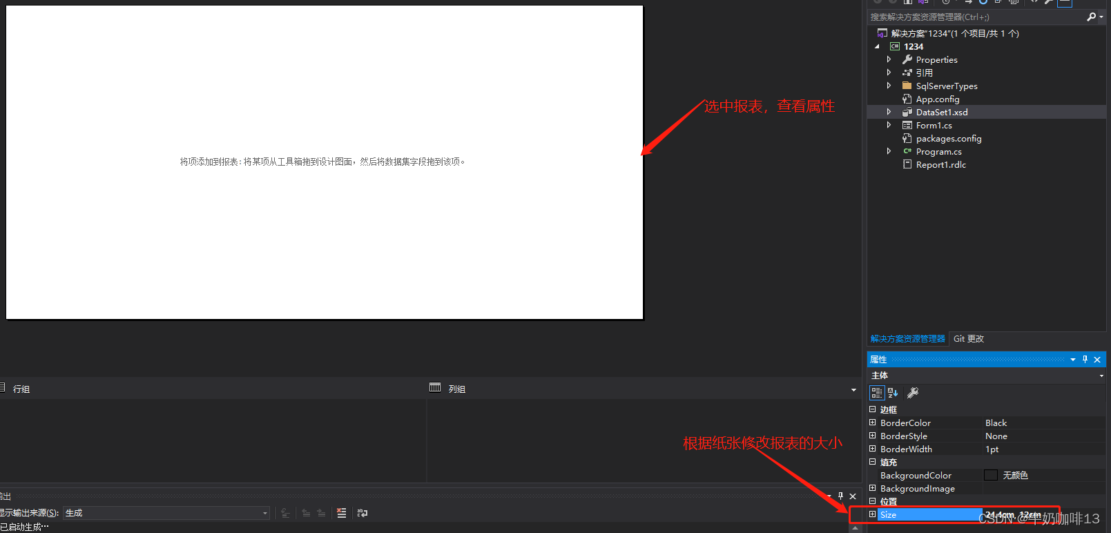 首先 添加前面设计好的数据集,然后修改报表的大小(根据纸张实际大小填写);接着设计报表(比如插入表、文本框等内容)