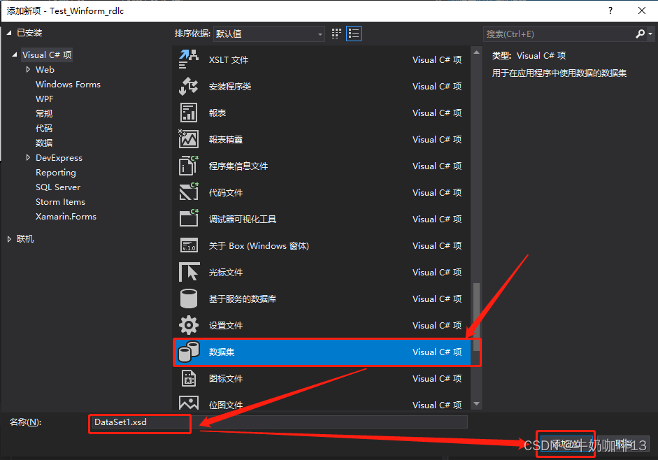 选择项目,点击鼠标右键-->选择【添加】-->选择【新建项】-->选择【数据集】(可修改数据集名称)