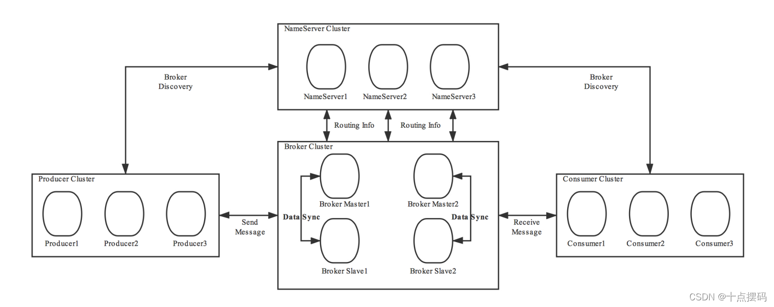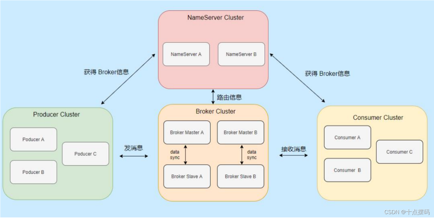 - NameServer:NameServer是一个非常简单的Topic路由注册中心,其角色类似Dubbo中的zookeeper,支持Broker的动态注册与发现。主要包括两个功能:Broker管理,NameServer接受Broker集群的注册信息并且保存下来作为路由信息的基本数据。然后提供心跳检测机制,检查Broker是否还存活;路由信息管理,每个NameServer将保存关于Broker集群的整个路由信息和用于客户端查询的队列信息。然后Producer和Conumser通过NameServer就可以知道整个Broker集群的路由信息,从而进行消息的投递和消费。NameServer通常也是集群的方式部署,各实例间相互不进行信息通讯。Broker是向每一台NameServer注册自己的路由信息,所以每一个NameServer实例上面都保存一份完整的路由信息。当某个NameServer因某种原因下线了,Broker仍然可以向其它NameServer同步其路由信息,Producer,Consumer仍然可以动态感知Broker的路由的信息。