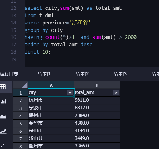 统计浙江省销量大于某量的销售城市排名 (子查询)  -