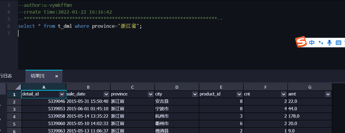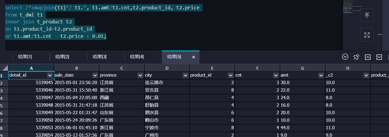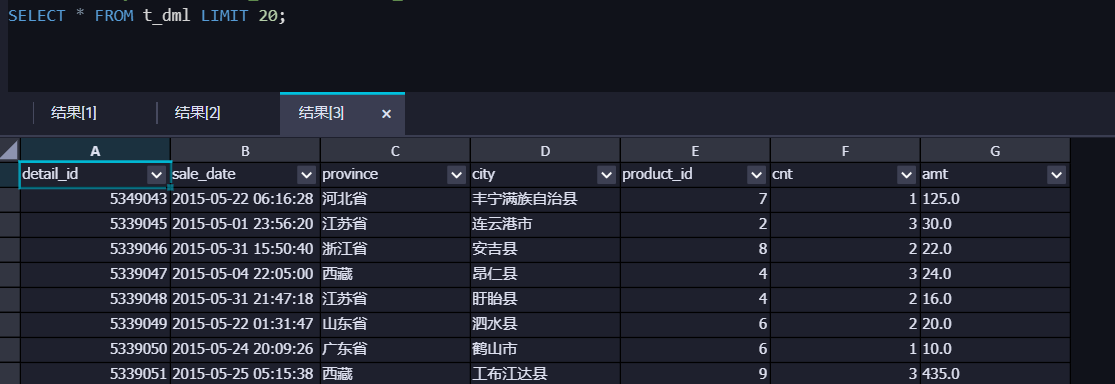 select detail_id,sale_date,province,city,product_id,cnt,amt