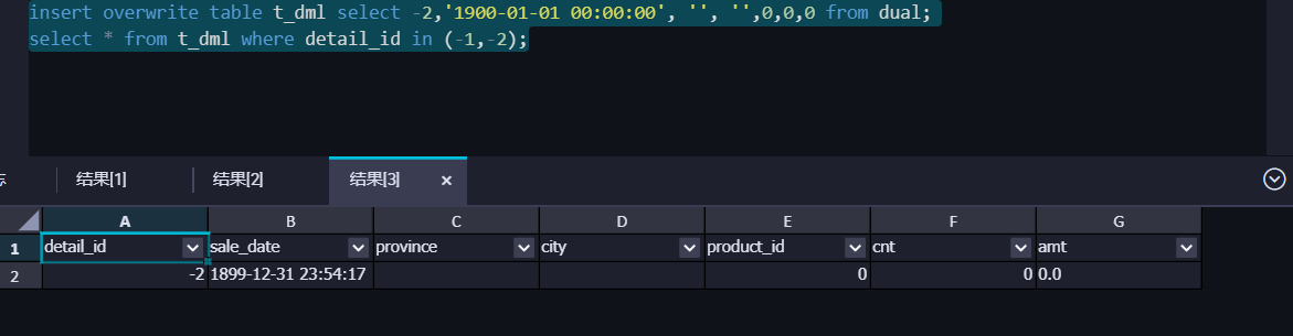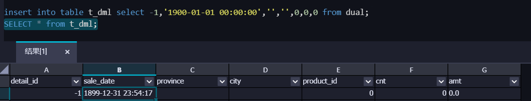 insert into table t_dml select -1,'1900-01-01 00:00:00','','',0,0,0 from dual;
