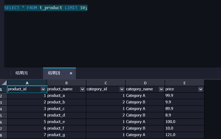 先展示一下t_product表,事实表t_dml包含了销售记录信息,其中字段 product_id为产品标识,可以关联另一张维表t_product获得产品的说明信息。