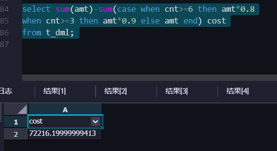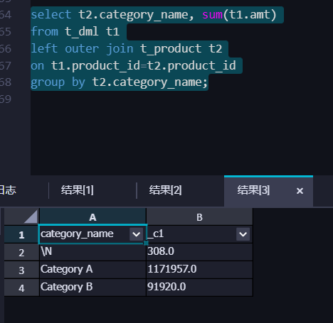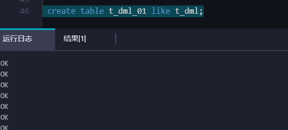 2. 创建临时表  3. 将表t_dml中的数据按不同条件同时输出到新建的表和新建的t_dml_p的两个分区中