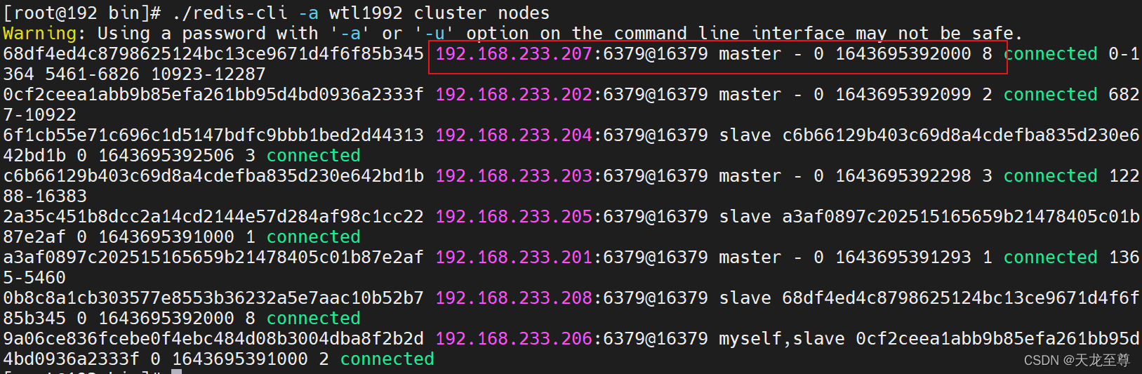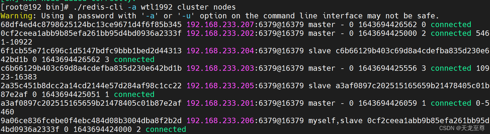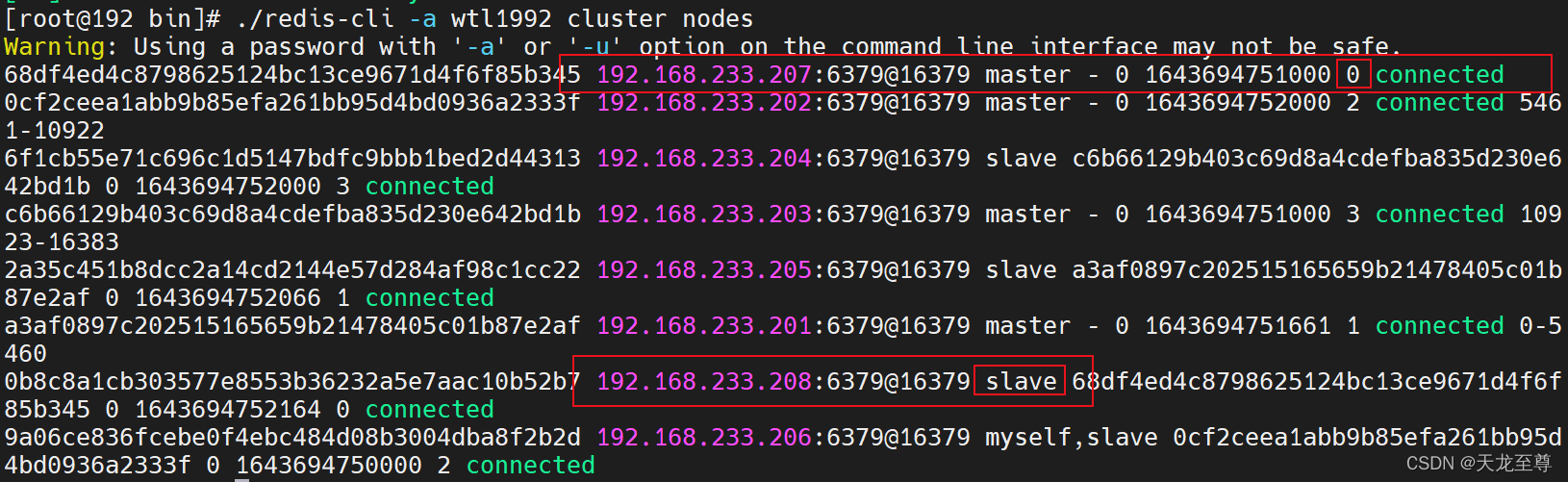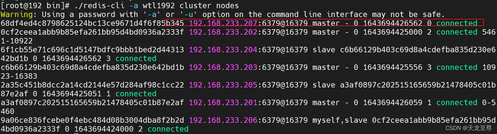 ./redis-cli -a wtl1992 cluster nodes