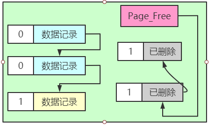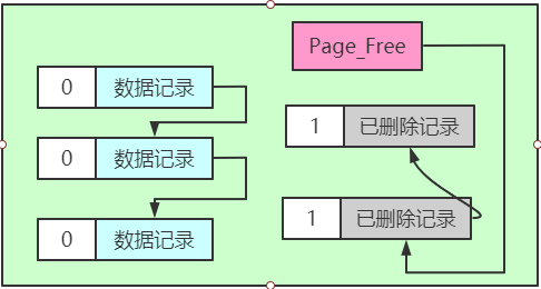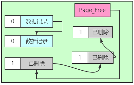 我们知道插入到页面中的记录会根据记录头信息中的 next_record 属性组成一个单向链表, 我们把这个链表称之为正常记录链表; 被删除的记录其实也会根据记录头信息中的 next_record 属性组成一个链表, 只不过这个链表中的记录占用的存储空间可以被重新利用, 所以也称这个链表为垃圾链表。 Page Header 部分有一个称之为 PAGE_FREE 的属性, 它指向由被删除记录组成的垃圾链表中的头节点。