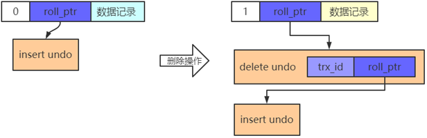 同时, 在对一条记录进行 delete mark 操作前, 需要把该记录的旧的 trx_id和 roll_pointer 隐藏列的值都给记到对应的 undo 日志中来, 就是我们图中显示的old trx_id 和 old roll_pointer 属性。 这样有一个好处, 那就是可以通过 undo 日志 的 old roll_pointer 找到记录在修改之前对应的 undo 日志。 比方说在一个事务中,我们先插入了一条记录, 然后又执行对该记录的删除操作, 这个过程的示意图就是这样: