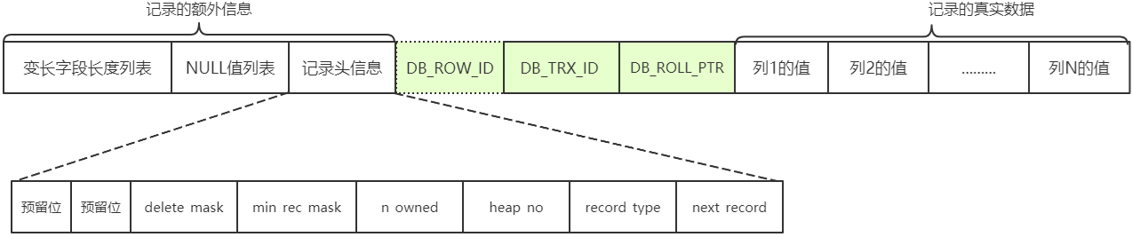 我们在学习 InnoDB 记录行格式的时候重点强调过: 聚簇索引的记录除了会保存完整的用户数据以外, 而且还会自动添加名为 trx_id、 roll_pointer 的隐藏列,如果用户没有在表中定义主键以及 UNIQUE 键, 还会自动添加一个名为 row_id的隐藏列。