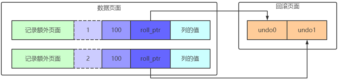 roll_pointer 本质上就是一个指向记录对应的 undo 日志的一个指针。 比方说我们向表里插入了 2 条记录, 每条记录都有与其对应的一条 undo 日志。 记录被存储到了类型为 FIL_PAGE_INDEX 的页面中(就是我们前边一直所说的数据页) ,undo 日志被存放到了类型为 FIL_PAGE_UNDO_LOG 的页面中。 roll_pointer 本质就是一个指针, 指向记录对应的 undo 日志。