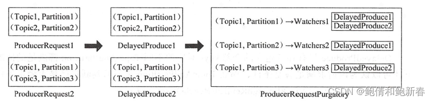 RequestPurgatory内部不同的TopicAndPartition产生对应的watchers,watchers内部的requests保存相同的TopicAndPartition对应的DelayedProduce。它们的关系如下:?