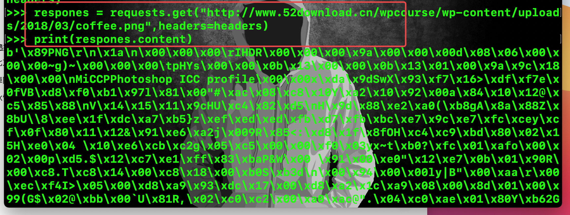 respones = requests.get("http://www.52download.cn/wpcourse/wp-content/uploads/2018/03/coffee.png",headers=headers) 回车
