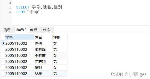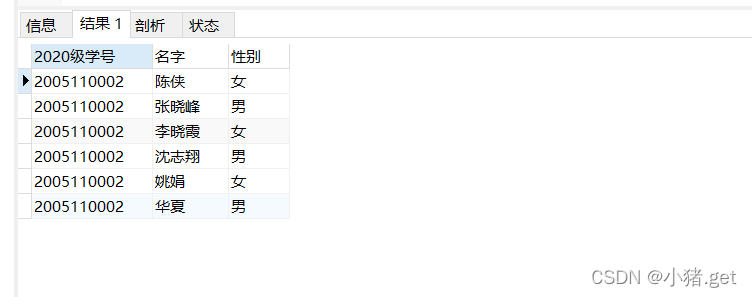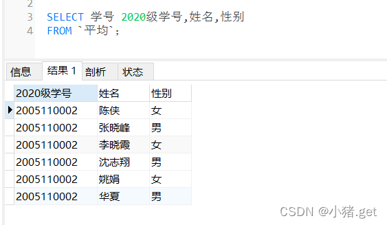 SELECT 学号 2020级学号,姓名 AS 名字,性别 "男女"