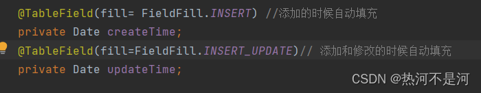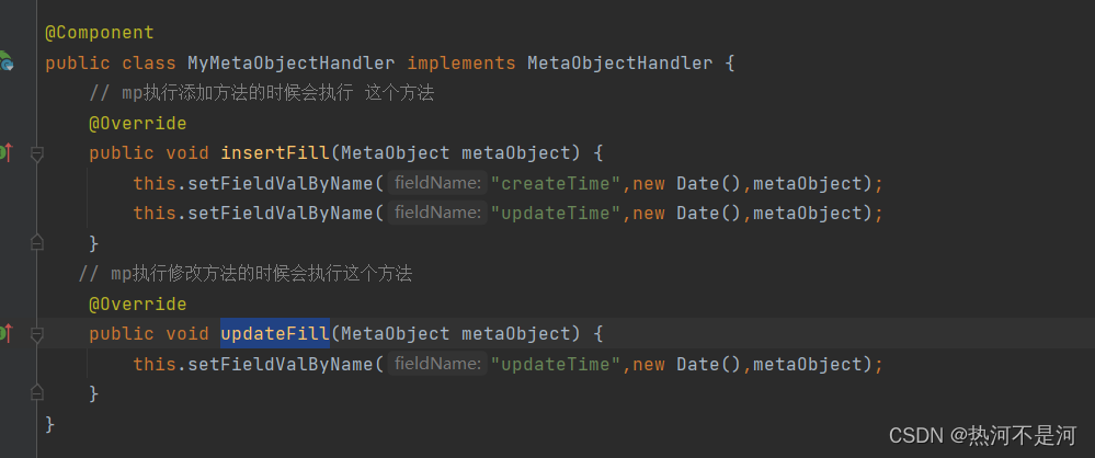 ? ? ? ? ? 4、写一个类来实现MetaObjectHandler接口,重写insertFill()和updateFill();方法里面是对自动填充的字段进行赋值操作,如下图所示: