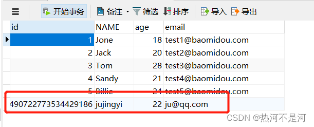 ?注意:可以看一下这个id的值,我没有设置id,它也没有自增,而是数据库给我们生成了一个id的值,这就牵扯到了mybatis-plus的主键策略了,下面讲解主键策略