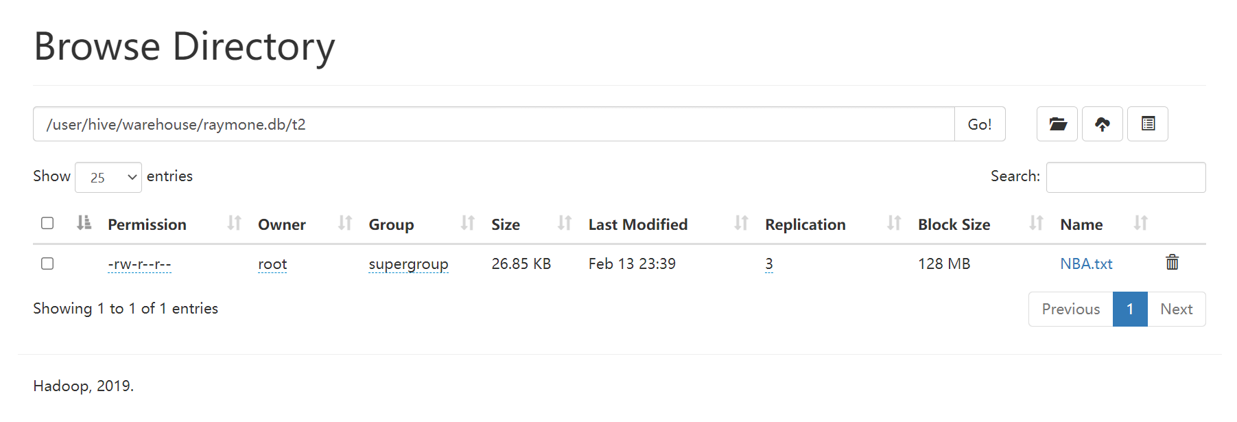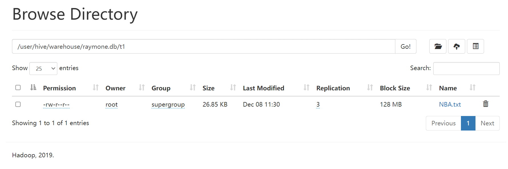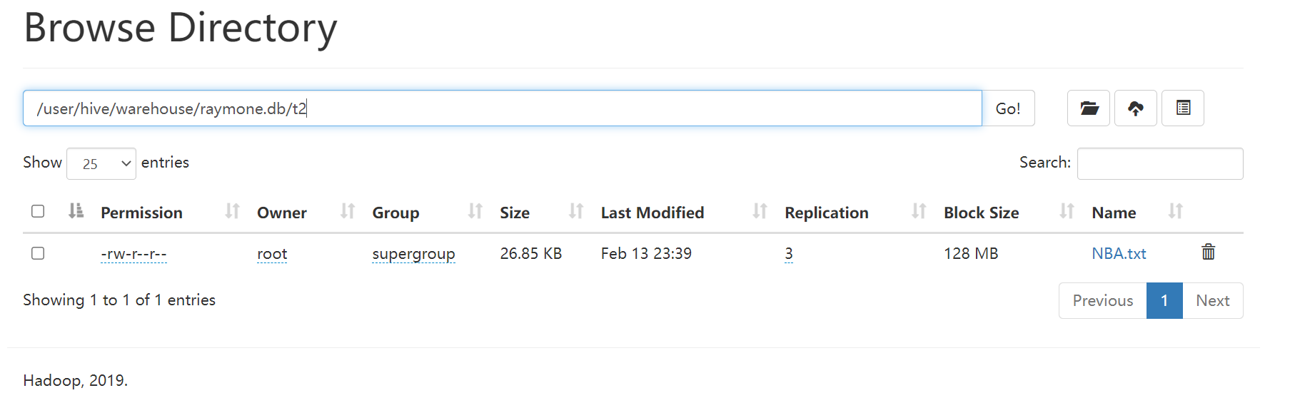 而t1在HDFS源数据直接被删除以及元数据也被删除。因为它是内部表。