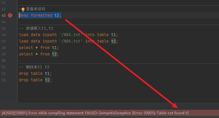 ?HDFS上只有t2的源数据还在,但是它的元数据已经没有了。这里显示表找不到。