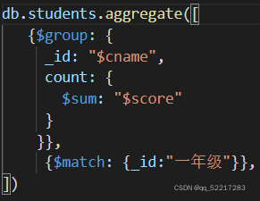 math来匹配cname属性等于(一年级),并计算每个分组的score属性总值